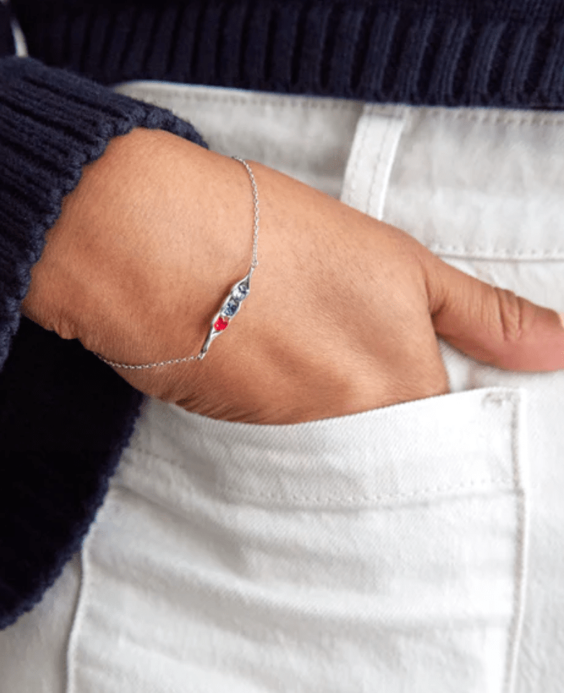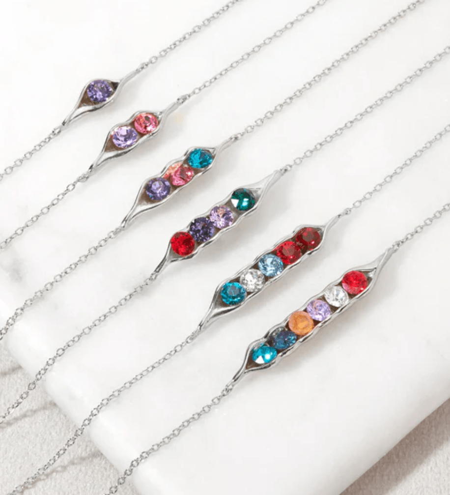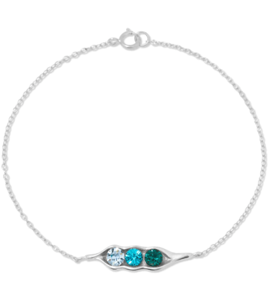 This bracelet incorporates birthstones into the gift allowing for thoughtful personalization. The peas are made up of different birthstones corresponding to different months in a year. The amount of peas can range from 1-6 and is able to be adjusted. This bracelet also comes in gold and rose gold starting at $60.