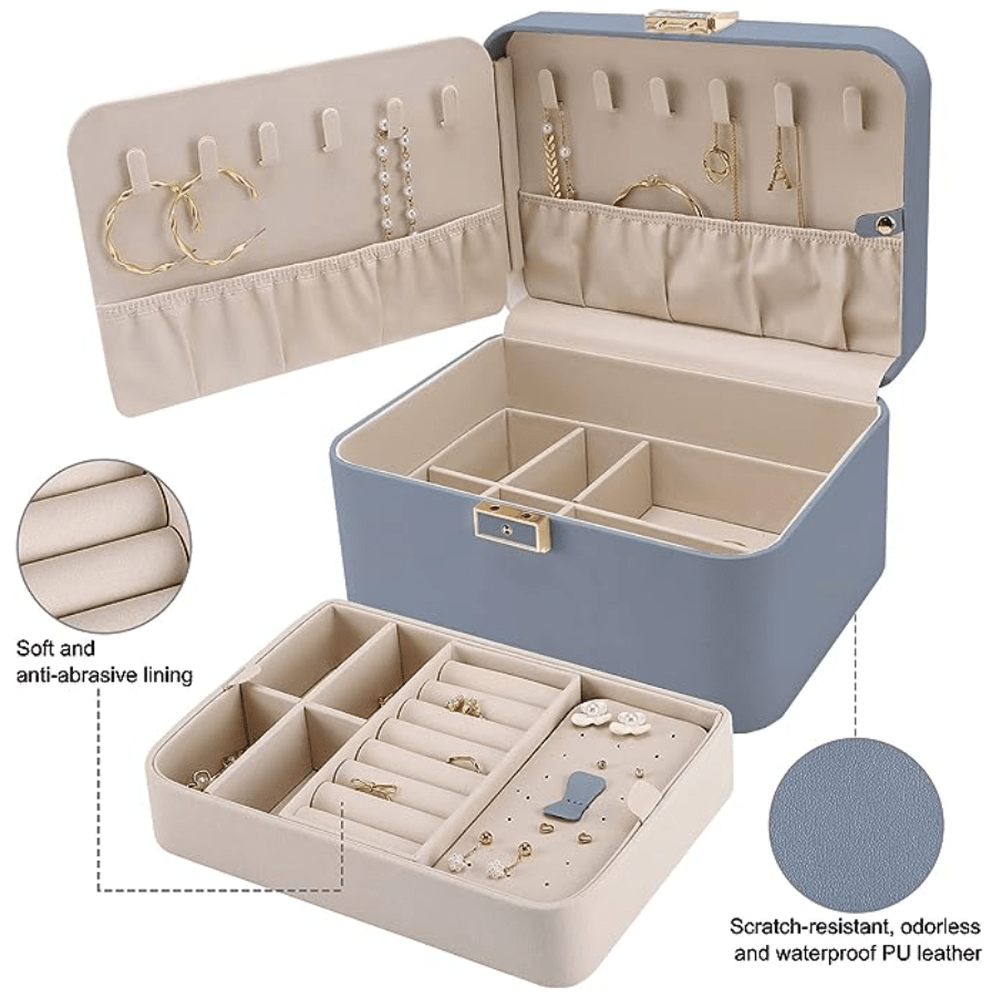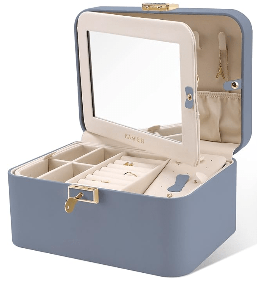 A good jewelry box is a necessity. This jewelry box has a mirror and is perfect for organizing jewelry of all sizes. It comes in 15 colors and costs $34.
