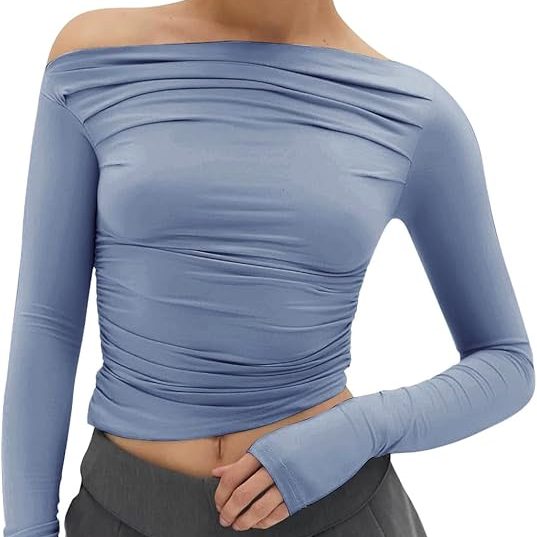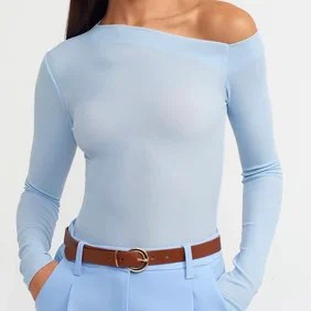 To enhance the warm tones of the brown leather pants and red shoes, I’ve chosen a light blue asymmetrical top. The cool hue and unique silhouette of the top draw attention to your face, adding dimension without overshadowing it.